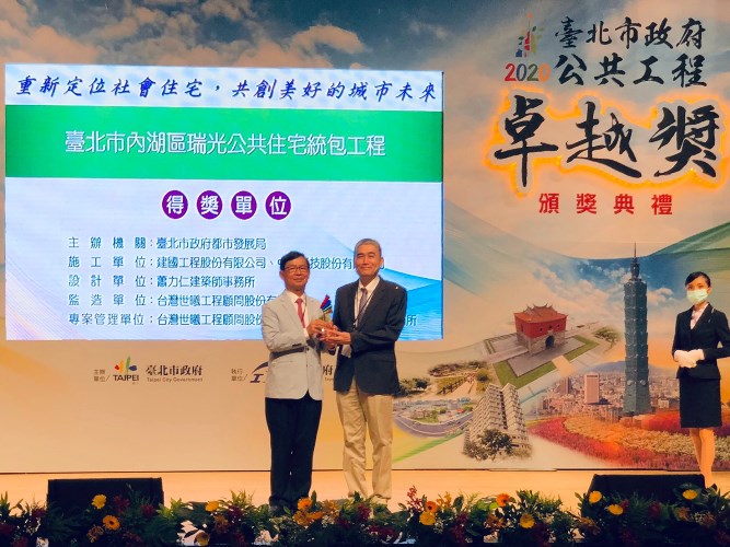 賀!狂賀!由建國工程承攬的臺北市內湖區瑞光公共住宅統包工程,榮獲「109年臺北市政府公共工程卓越獎」,於8月14日頒獎典禮上由吳昌修董事長代表授獎。
