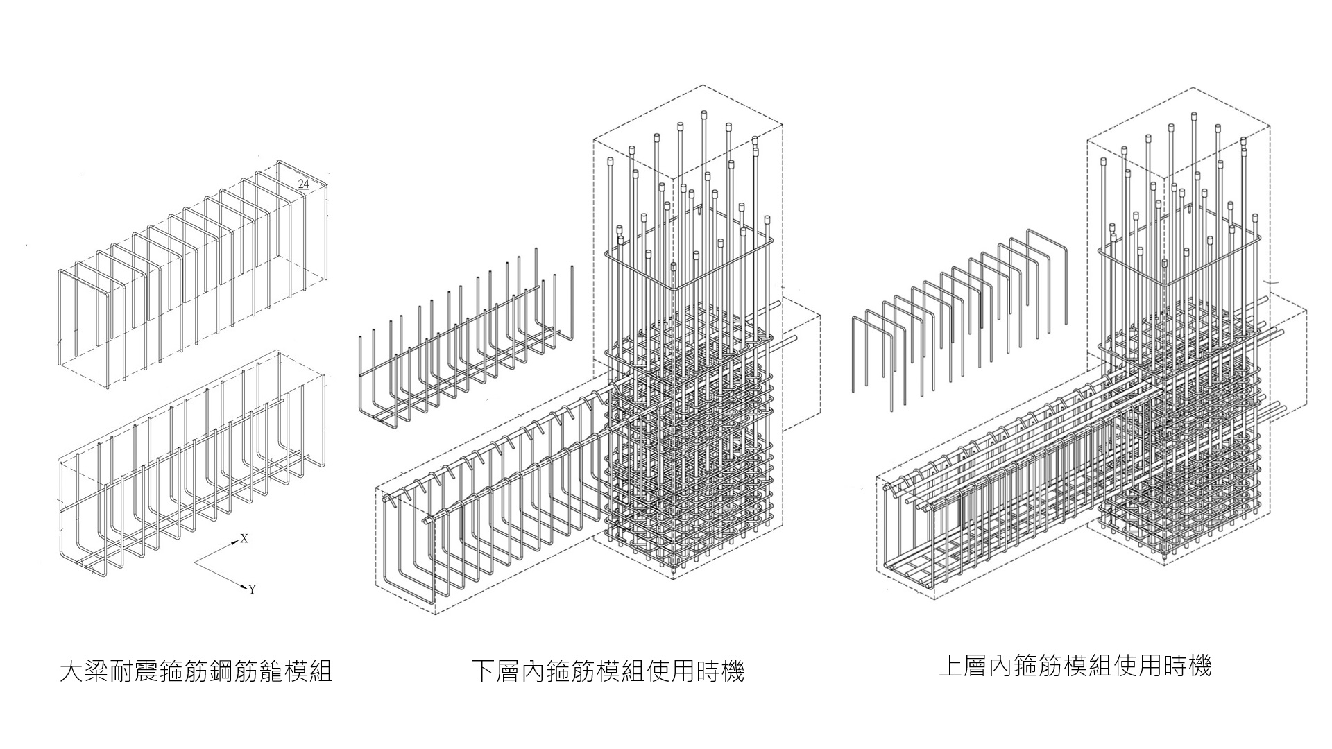 依規範大梁兩端高剪力區需使用箍筋束製粱內側主筋,為提高鋼筋工項工率開發鋼筋籠模組形式內箍筋,由上下兩組U箍筋組成,其中下層箍筋需以點焊鋼絲網連接達到自立性需求,上層箍筋則可焊接成模組或逐一安裝。