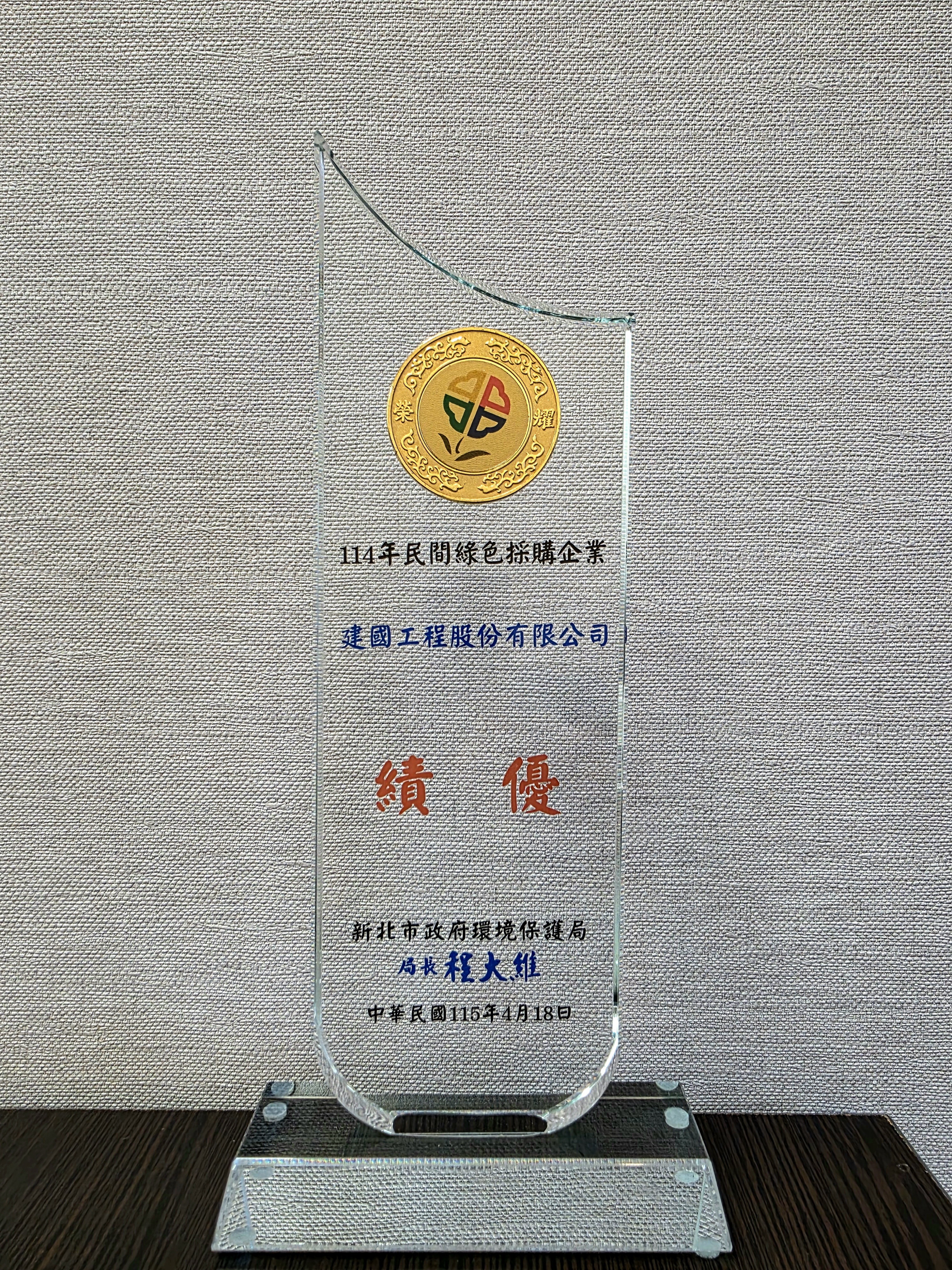 建國工程致力於將永續理念融入營運決策,114年持續深化綠色採購推動,榮獲新北市政府環境保護局頒發「民間綠色採購績優企業」肯定,展現企業在永續採購上的積極作為。